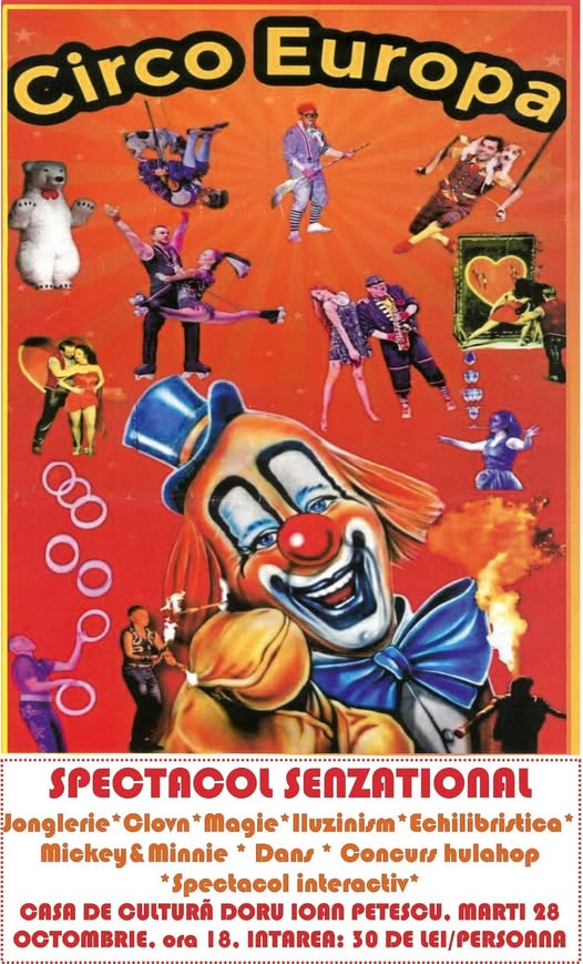 Cei mici şi cei mari sunt aşteptaţi la un spectacol interactiv şi vesel, prezentat de Circo Europa. Programul va include clovni, numere de magie, jonglerie şi dans şi va avea loc marţi, de la ora 18.00 la Casa de Cultură Doru Ioan Petescu. Intrarea costă 30 de lei/persoană.
