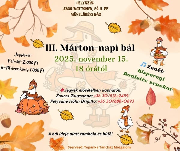 Cu ocazia zilei onomastice Márton, la Bătania se va organiza în data de 15 noiembrie de la ora 18.00 pentru a treia oară tradiționalul Bal Márton. Evenimntul va avea loc la căminul cultural din localitate, biletul de intrare costă 2000 de forinți pentru adulți și 1000 de forinți pentru copii. Cântă formația Roulette din Peregu Mic.