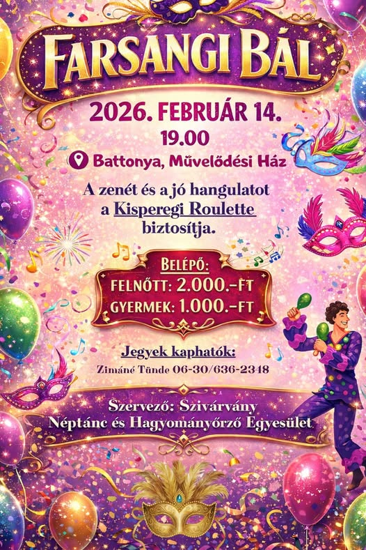 You are here: Home › Știri din Bătania › Bal „Farsang” la Bătania ← Autobuze electrice pentru Pecica Relansarea transportului public local → Bal „Farsang” la Bătania Casa de Cultură din Bătania organizează și în acest an tradiționalul Farsangi Bál care va avea loc în data de 14 februarie de la ora 19.00. Detalii: